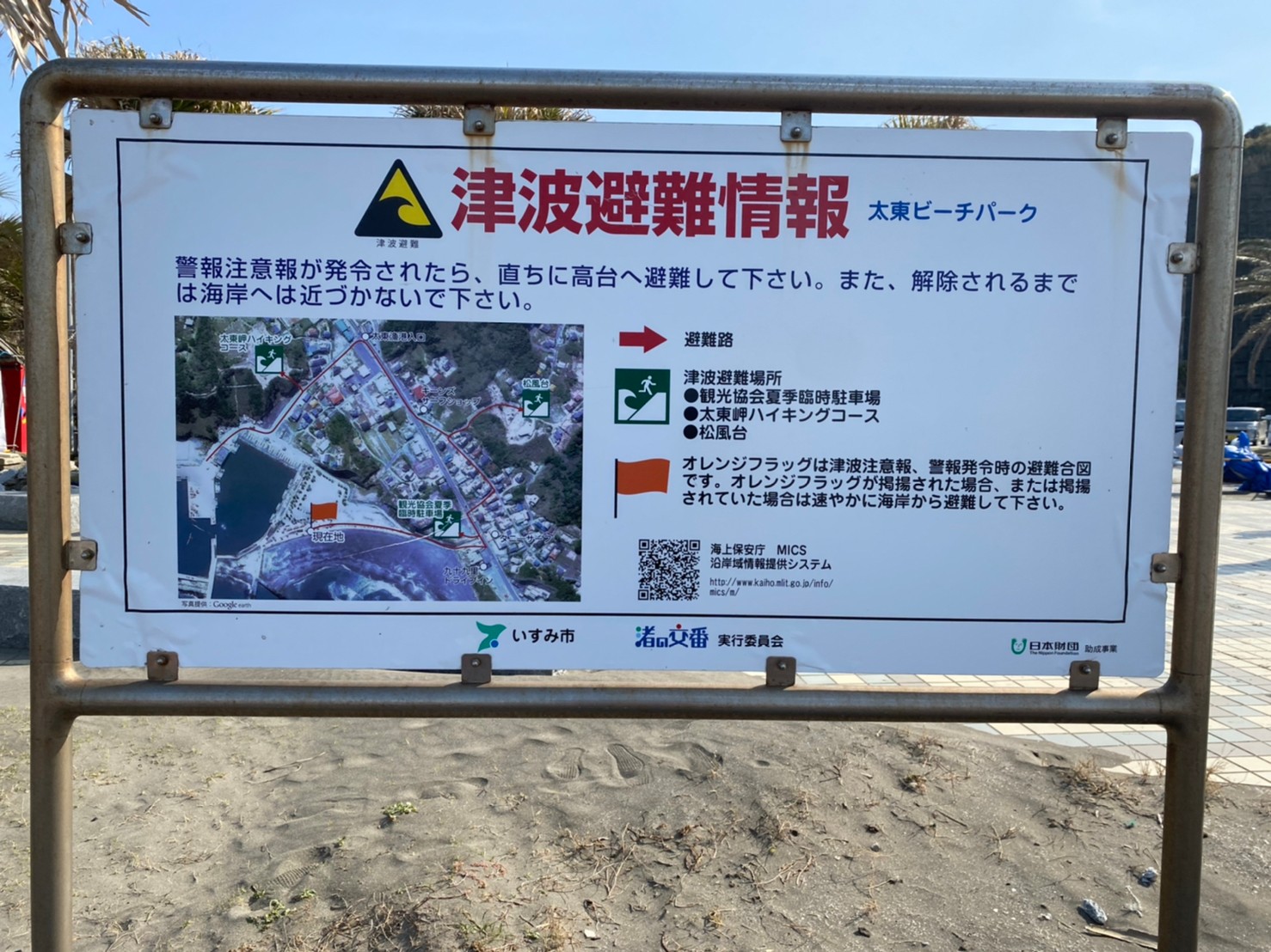 このポールに旗が見えたら、すぐに海から上がって高台に!